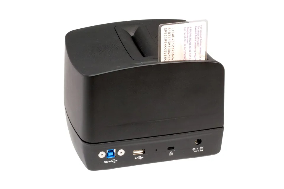 Este lector de documentos realiza el escaneo automático a doble cara y la verificación de autenticidad de tarjetas de identidad, permisos de conducir, tarjetas de la seguridad social y otros documentos. Se conecta al PC mediante cable USB-3.0.