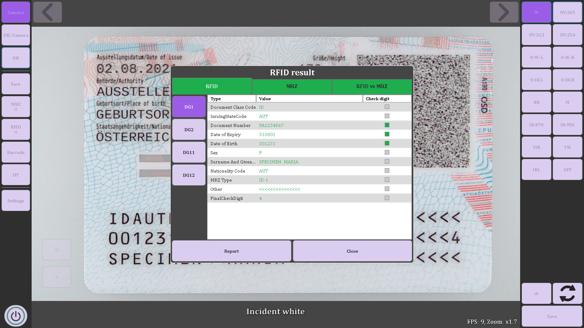 Examen de todos los elementos de seguridad del sustrato del documento (marcas de agua, fibrillas de seguridad, etc.), identificación de técnicas de impresión y verificación de tintas de seguridad fluorescentes UV e IR.