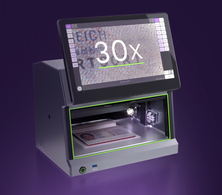 El dispositivo utiliza 12 fuentes de luz para una inspección completa de los elementos de seguridad de documentos con una magnificación de pantalla de 30x.