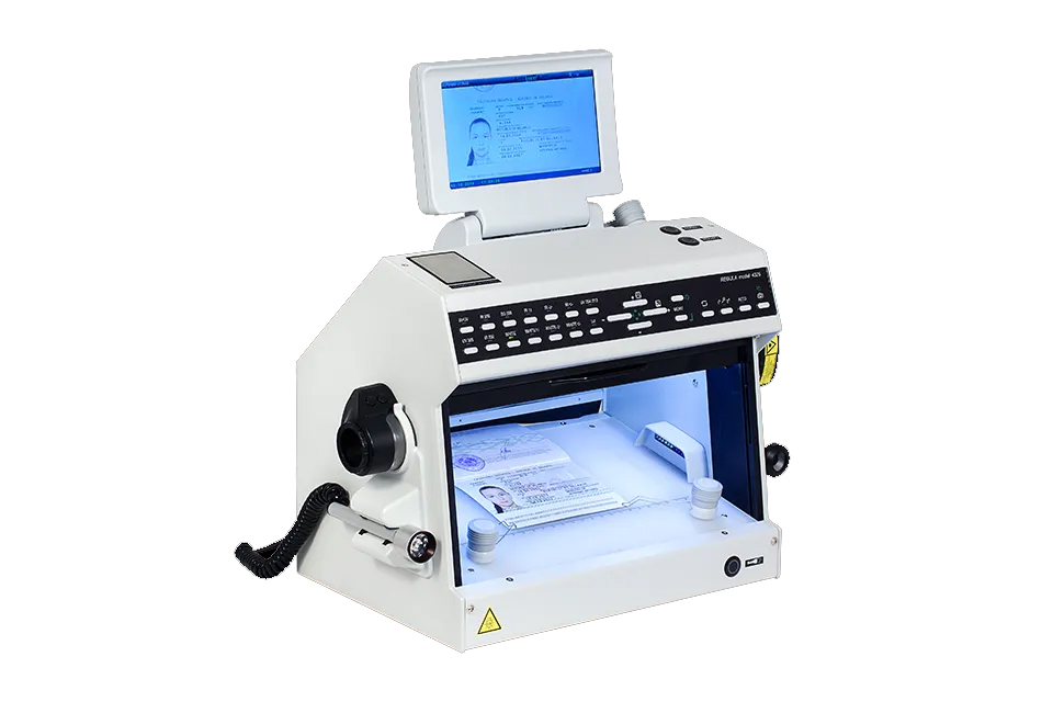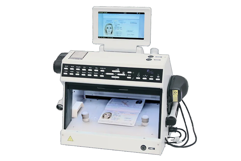 El dispositivo de escritorio Regula 4325 está destinado a la verificación en primera línea de documentos. Se maneja con los botones de control del panel frontal. Los botones de control se utilizan para activar las fuentes de luz y ajustar los parámetros de la cámara, así como la temperatura del termostato (+10…+50˚С). El dispositivo está equipado con una pantalla de 7 pulgadas. Además, se puede conectar un monitor adicional.