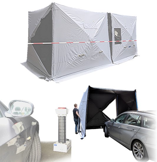 Sistema portátil de revelado de huellas mediante evaporación de cianoacrilato. Mobifume es un nuevo sistema innovador que permite al investigador fumigar toda una escena o utilizar la carpa diseñada para este sistema e introducir grandes objetos como coches, bicicletas, motos… para revelar huellas de manera fácil y segura.