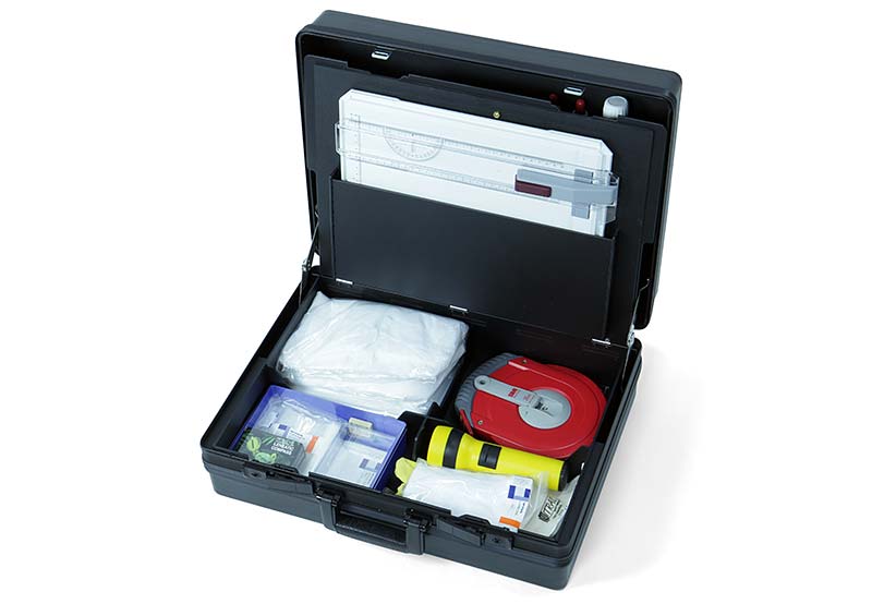 Este kit está diseñado para el marcado y registro de accidentes de tráfico. Contiene los materiales necesarios para realizar un croquis de la situación (tablero de dibujo, materiales de dibujo, etc.), así como materiales de marcado para facilitar la documentación fotográfica.