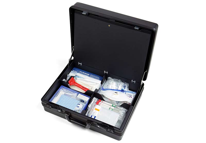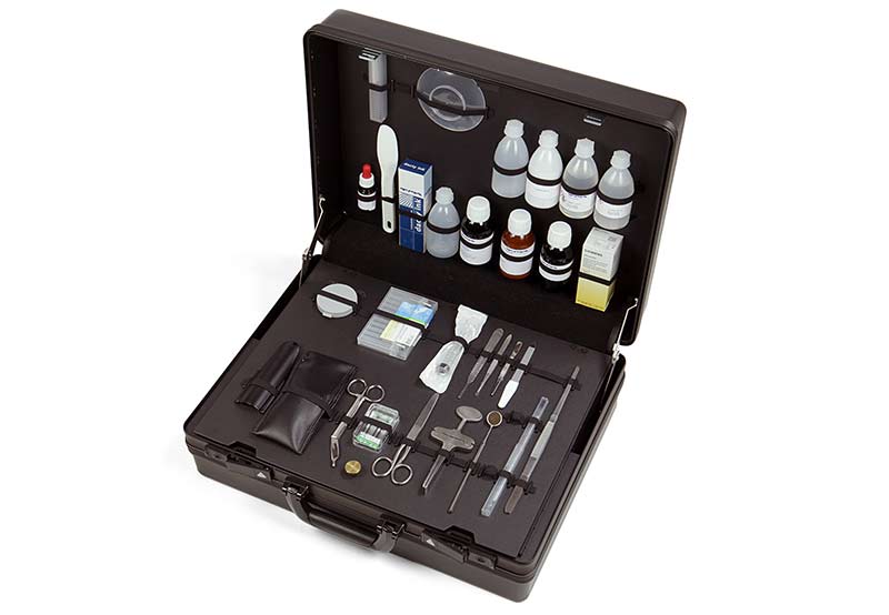 El kit post-mortem ha sido especialmente compuesto para el examen de fallecidos víctimas de delitos o accidentes. Una gran parte del equipo consta de materiales y equipos para tomar huellas dactilares post mortem y realizar modelos de dientes.