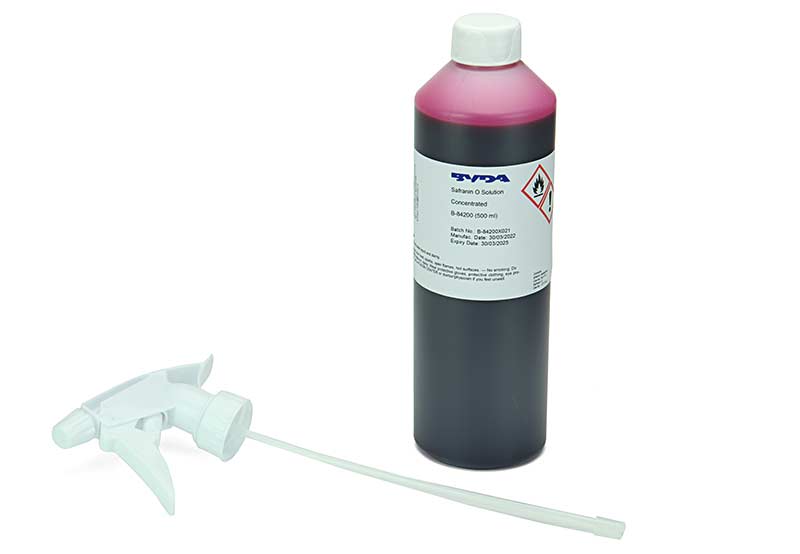 La safranina O es un colorante para cianoacrilato que emite fluorescencia bajo luz verde (utilice gafas o filtros rojos para ver y fotografiar la fluorescencia). Las soluciones B-84100/84200 son soluciones concentradas que deben diluirse fuertemente (con etanol) para preparar soluciones de trabajo. La fluorescencia es menos intensa que con el amarillo básico 40.