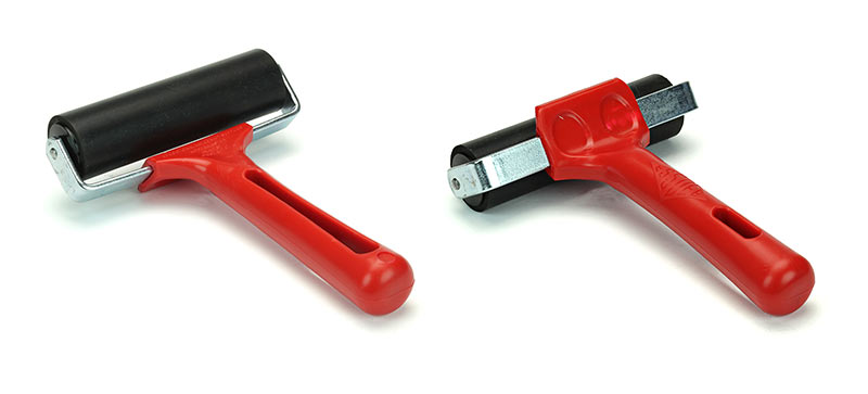 Rodillo para extender tinta con mango de plástico.