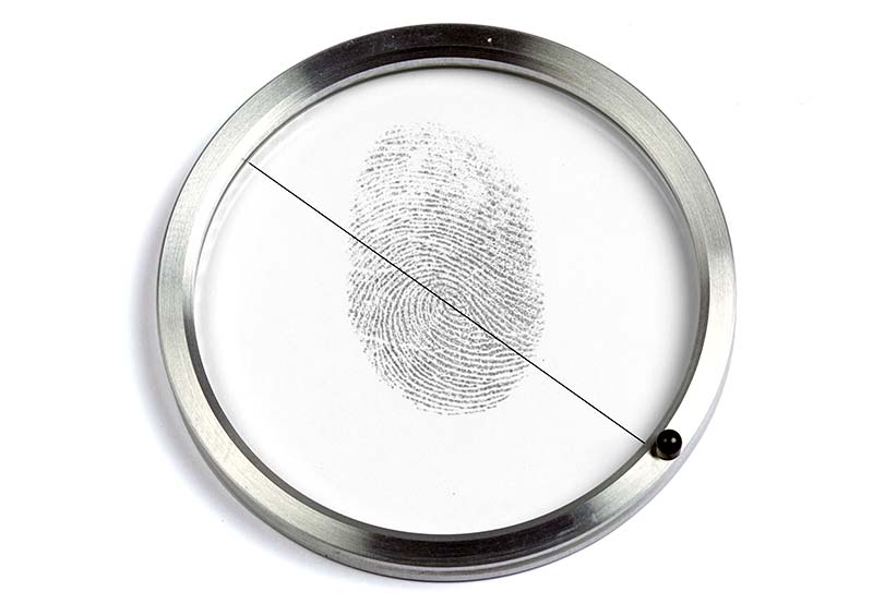 Lupa para huellas dactilares que se puede utilizar con un disco codificador (disco de clasificación). Por ejemplo, uno con una sola línea: Henry-disc K-1100.