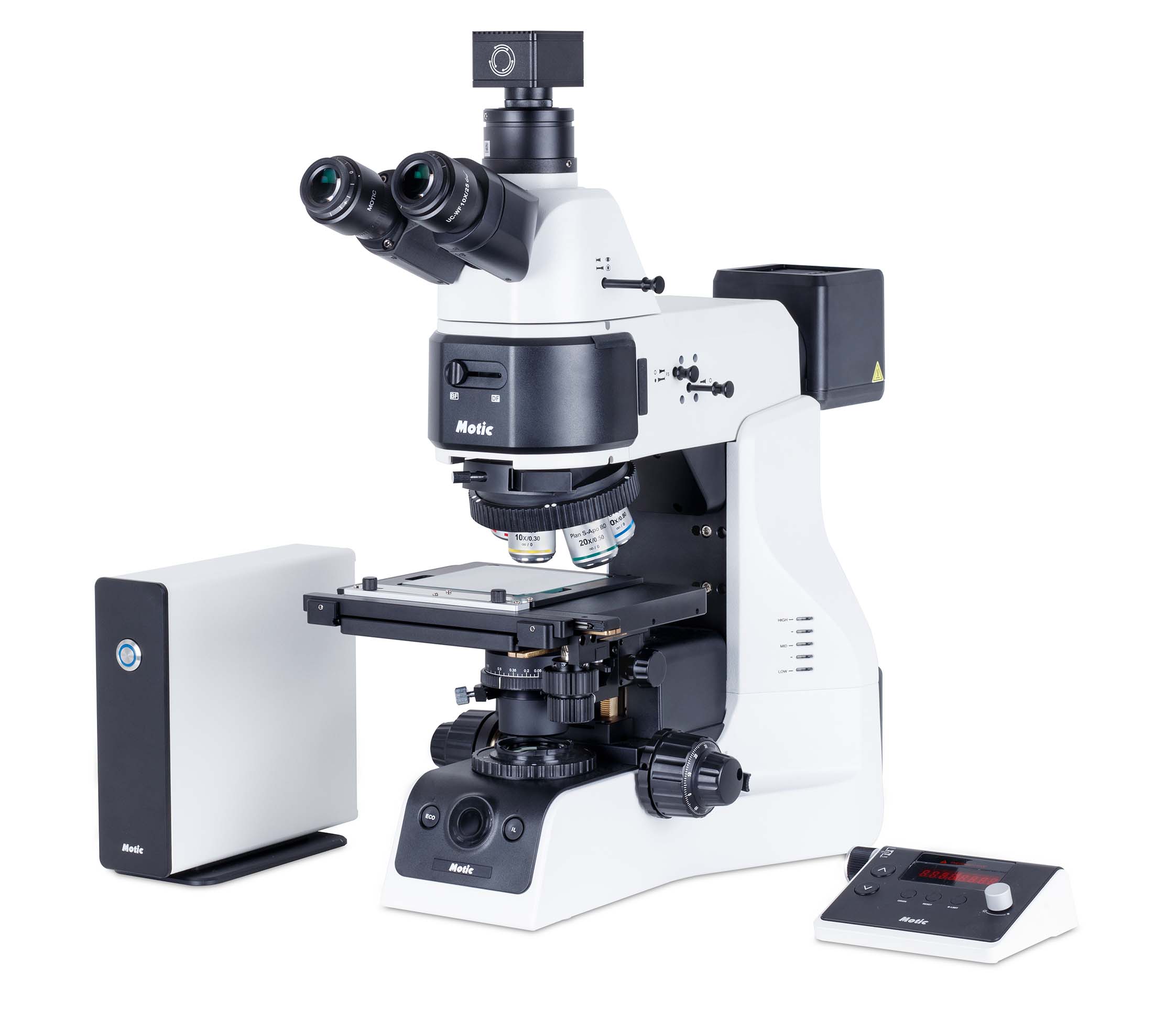 - Cuerpo intermedio: Epi-iluminador halógeno de cuarzo 100W con diafragmas de campo y apertura integrados, ranuras para filtros, filtros ND6, LBD y Módulo BF/DF.