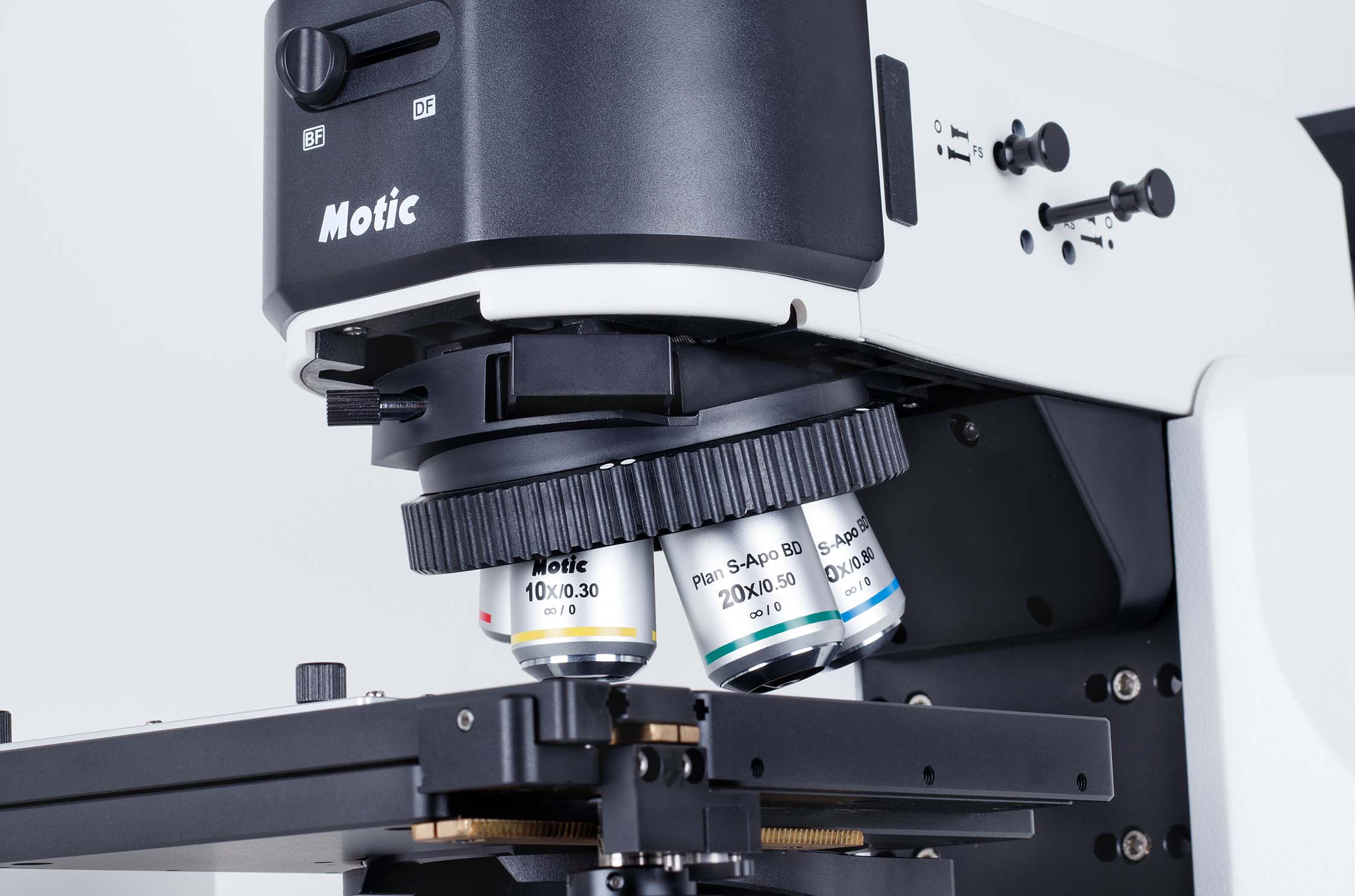 - Objetivos: 5X/0,15 (WD 20 mm), 10X/0,3 (WD 12 mm), 20X/0,45 (WD 3 mm), 50X/0,8 (WD 1 mm).